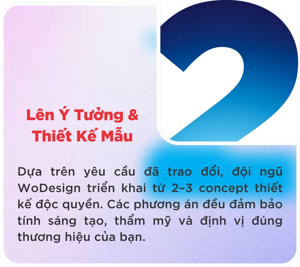 Không dùng mẫu sẵn, không đại trà. WoDesign khai thác sâu cá tính thương hiệu để tạo ra thiết kế độc quyền, phản ánh đúng giá trị cốt lõi và phong cách riêng của từng khách hàng.