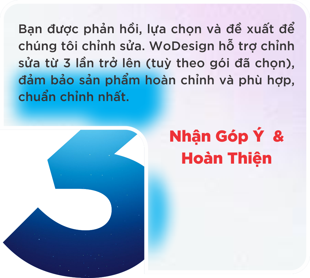 Có. Tùy theo từng gói thiết kế, bạn sẽ được chỉnh sửa 3 lần (gói cơ bản) hoặc không giới hạn (gói nâng cao, chuyên nghiệp) để đạt được phương án ưng ý nhất. WoDesign luôn đồng hành để đảm bảo bạn hài lòng.