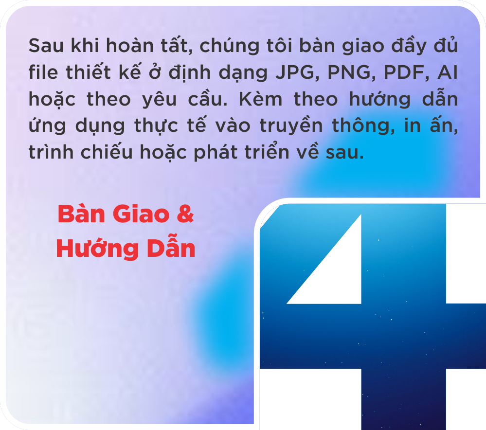 Từ 3–10 ngày tùy theo gói dịch vụ bạn chọn. Gói cơ bản thường hoàn thành trong 3–5 ngày, gói chuyên nghiệp sẽ cần thời gian nghiên cứu và phát triển ý tưởng kỹ hơn.